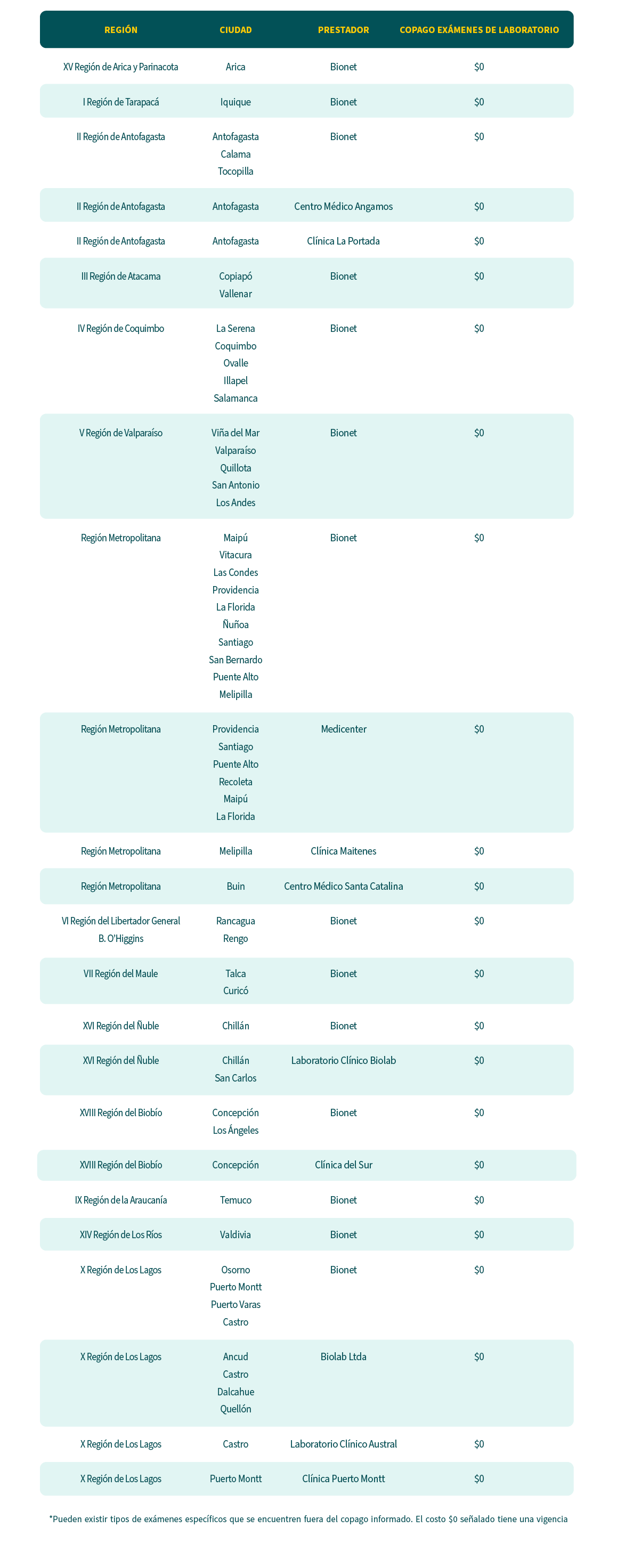 (*) Pueden existir tipos de exámenes específicos que se encuentren fuera del convenio costo $0. Todos los convenios están sujetos a cambios.